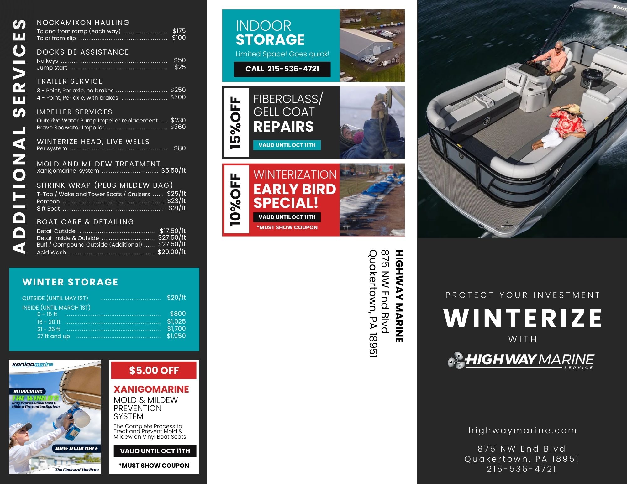 If you are in Pennsylvania or neighboring New Jersey and seeking services to winterize a boat, pontoon, outboard or inboard boat engine, Highway Marine does it all! We have trained, professional servicemen in Pennsylvania that know the ins and outs of preparing your boat and protecting it from the harsh Winter cold. Our experts provide quality boat winterization as well as boat storage and boat shrink wrapping. We shrink wrap, store and detail inside and outside of any boat up to 35 ft. long, personal water craft (PWC) or jet boat. You can count on us providing stellar service as well as the following essentials to prepare your boat for cold weather:
